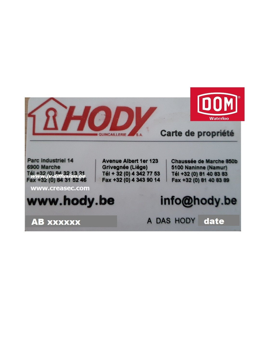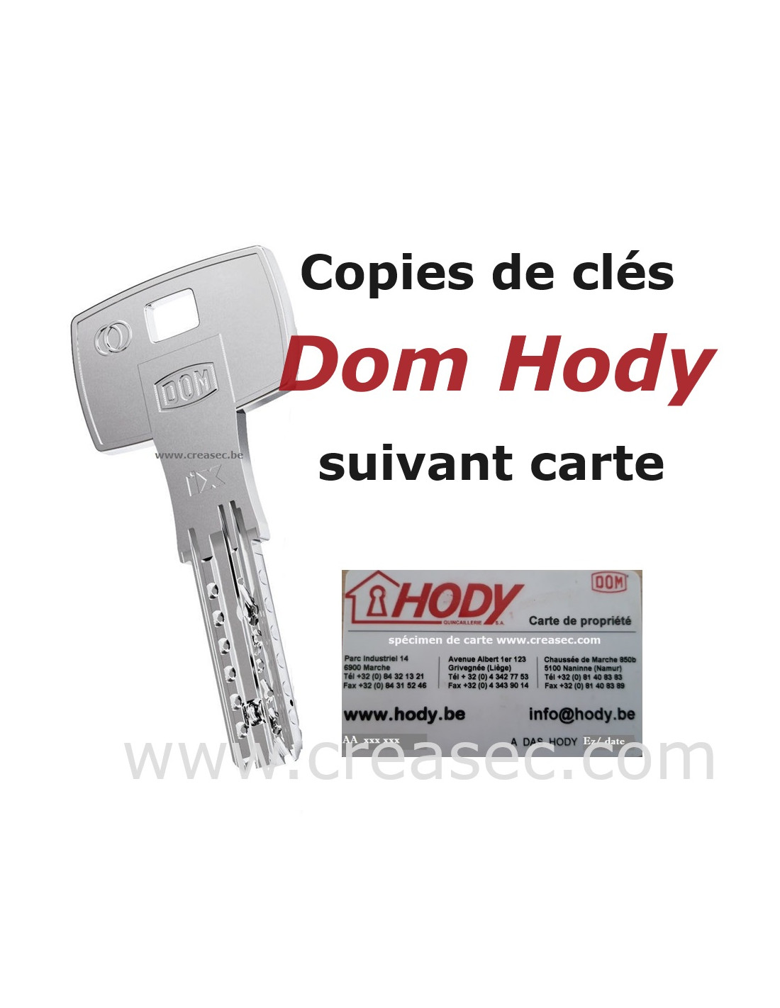 Reproduction de clés Dom Hody suivant votre carte de propriété. Ces clefs Dom Hody sont exclusivement reproduites par Dom. Un délai de +/- 1 semaine est à prévoir.